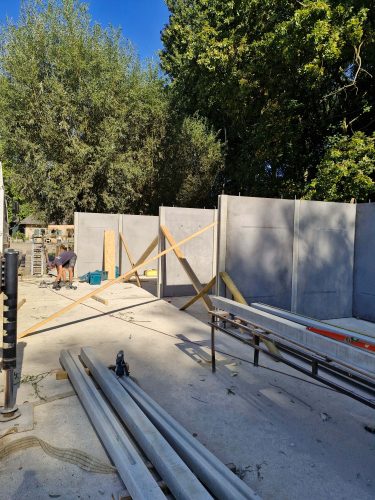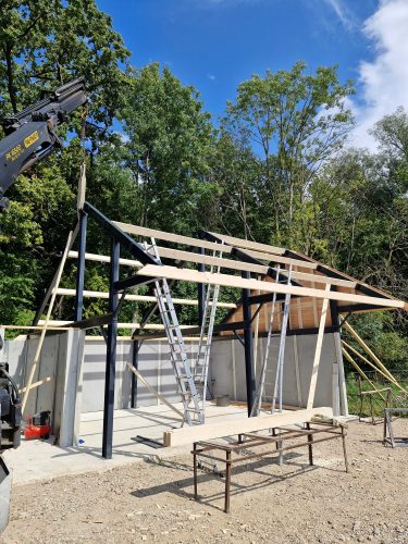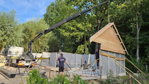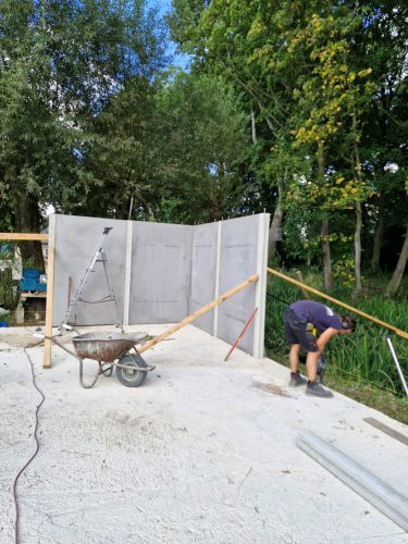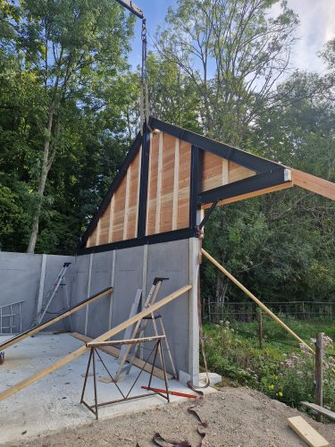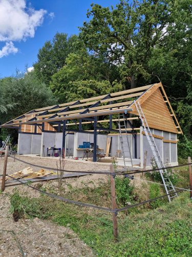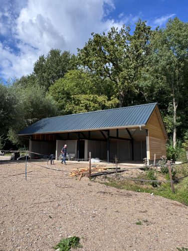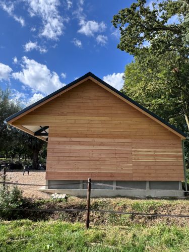 De basis van het bouwwerk bestaat, zoals gebruikelijk, uit onze duurzame betonnen elementen, gecombineerd met stevige stalen spanten. De buitenzijde is afgewerkt met karaktervolle Douglas potdekseldelen, die zorgen voor een warme, landelijke uitstraling. Het dak is uitgevoerd in geïsoleerde sandwichpanelen, wat bijdraagt aan een comfortabele temperatuur binnenin. De vloer is een solide, gewapende betonvloer. Praktisch, onderhoudsarm en bestand tegen intensief gebruik.